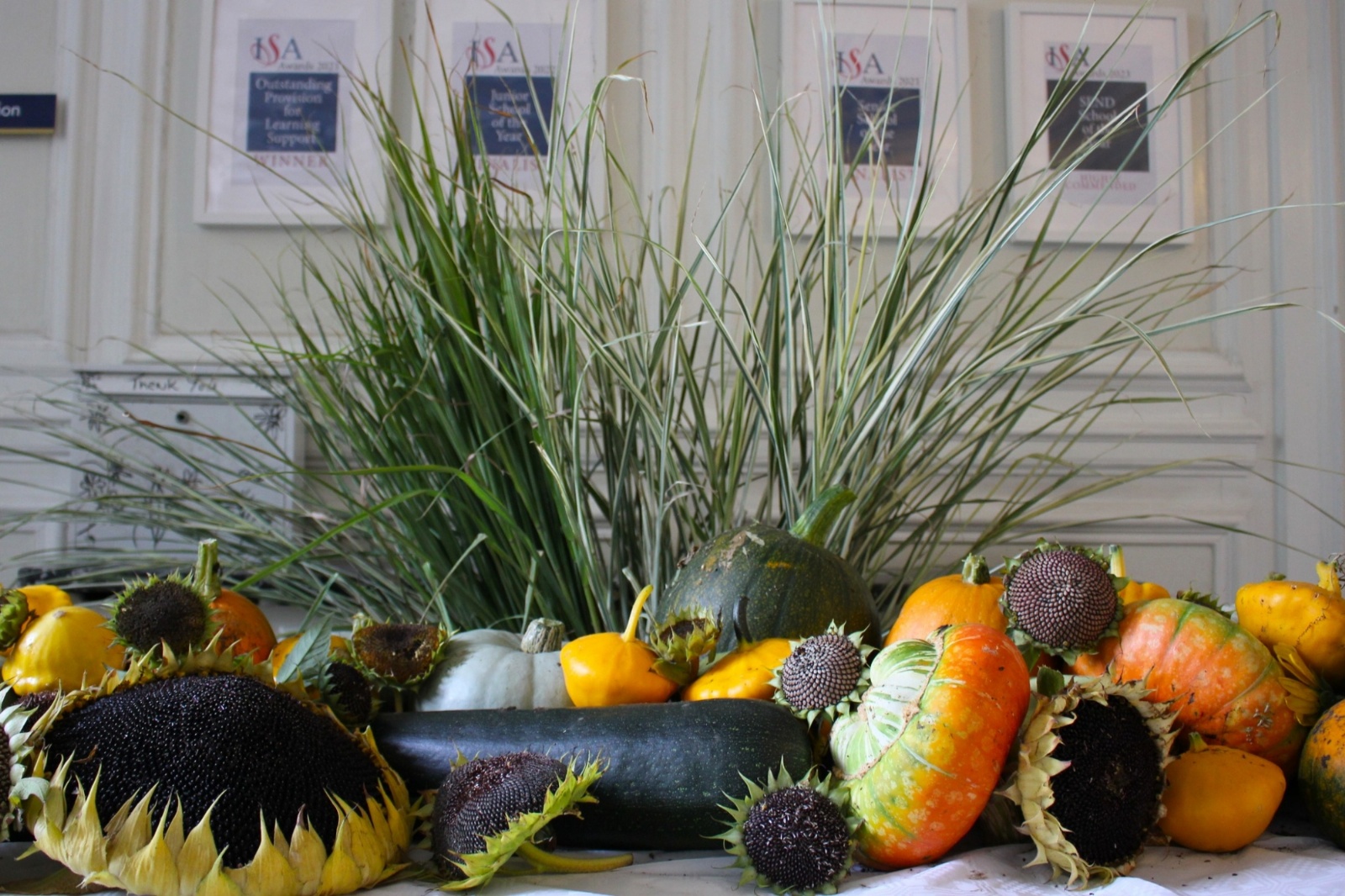 Among all the lovely dried sunflowers you can find a mixture of Crown Prince, Jack O Lantern, and Patty Pan, all picked from the school grounds.